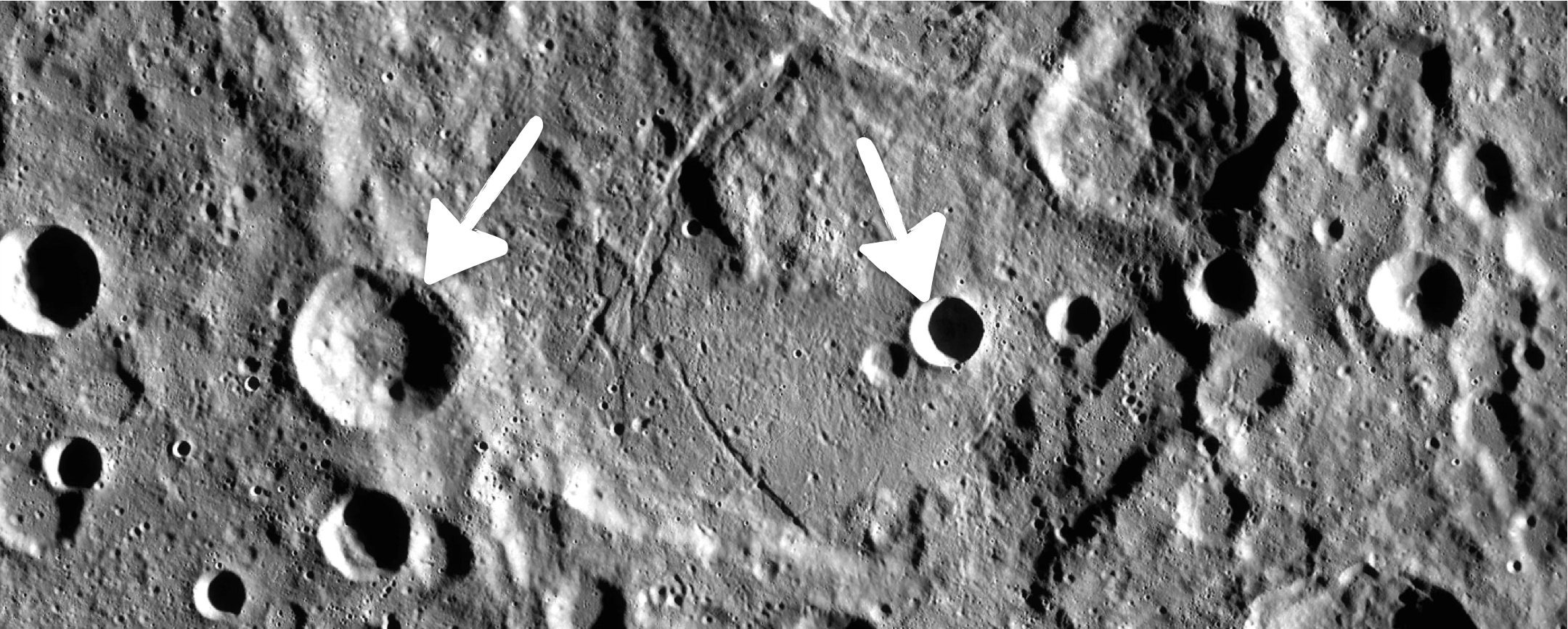 En déduire approximativement le ratio des masses des météorites ayant créés les deux cratères lunaires fléchés sur l’image ci-dessus en supposant qu’ils avaient la même vitesse.